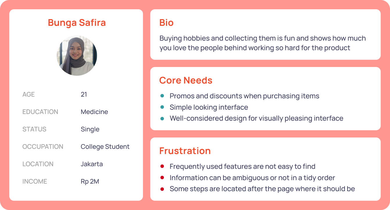 By using user persona according to how Shopee user is stereotipically, it will be much easier to analyse which needs are urgent for improvement from the original and frustrations to take care of.