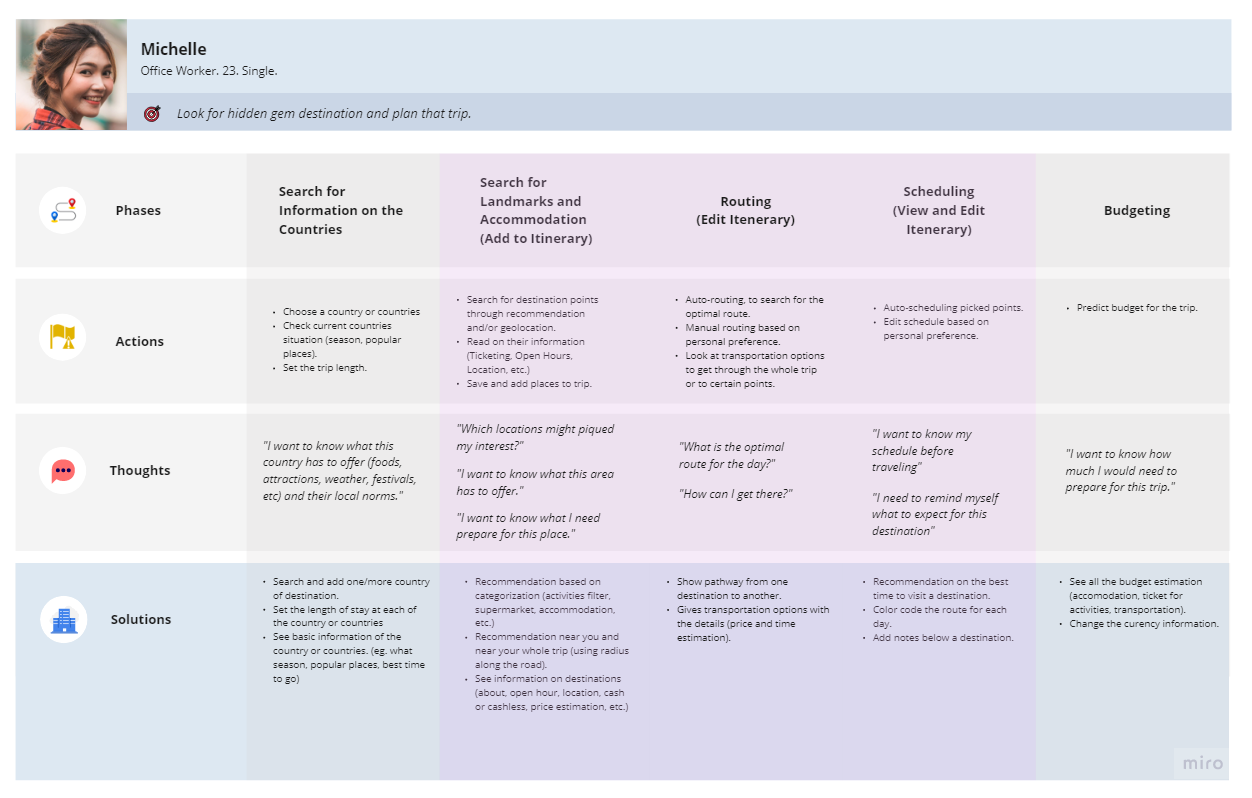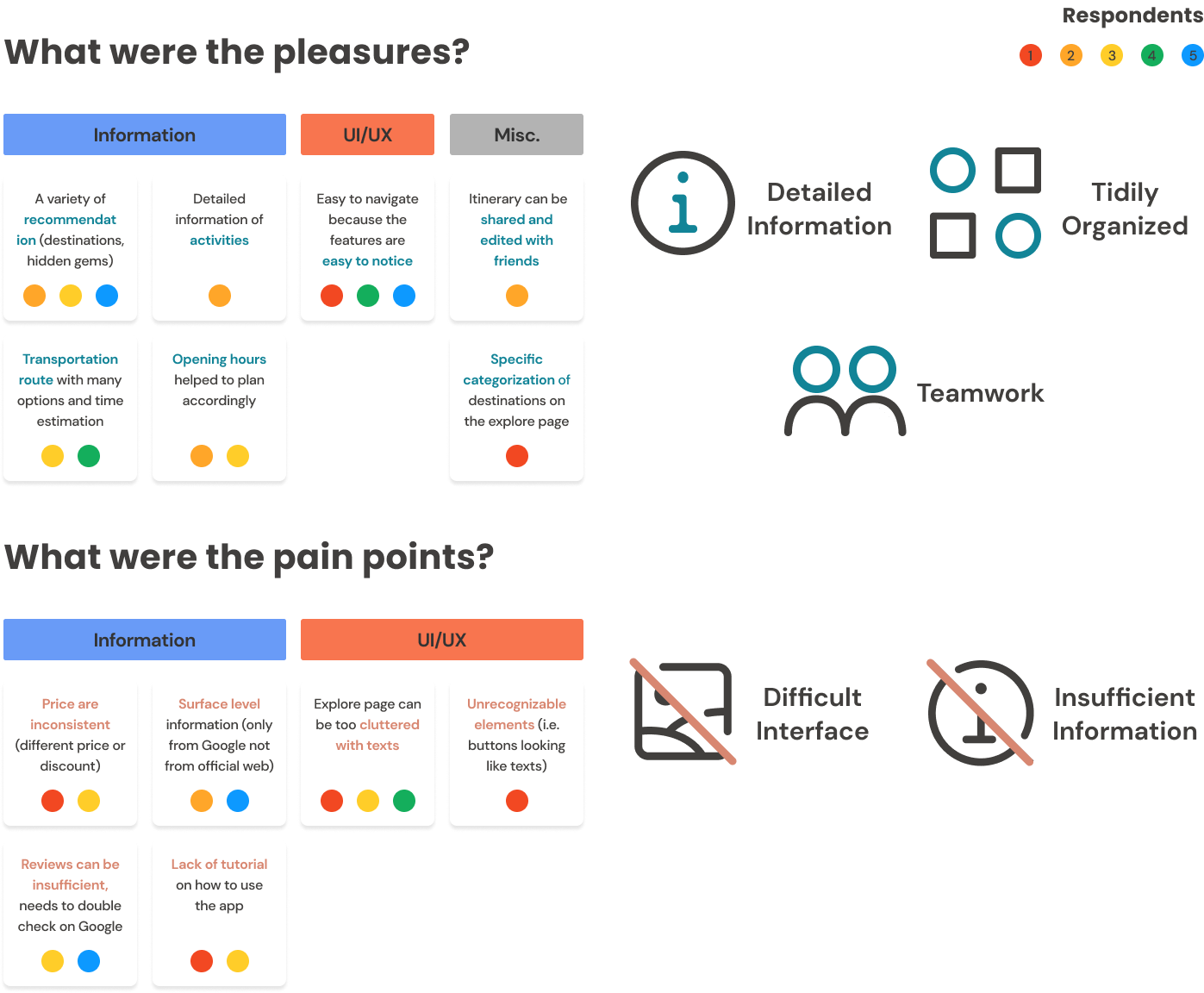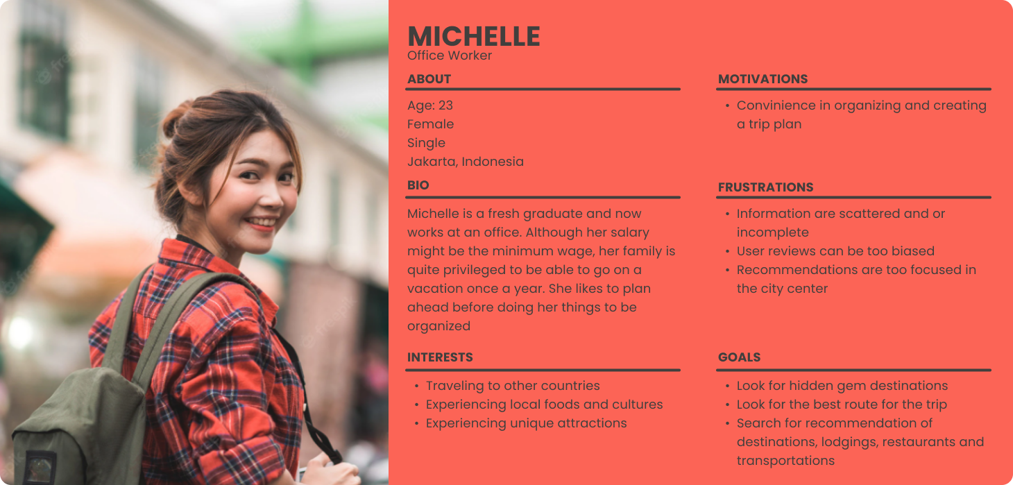 Using user persona according to how respondents experienced and need in the user interview, most of them seeks detailed information on destinations, accommodations, transportations and itinerary for a smooth trip.